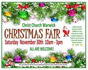 We hope to see you at the Church Fair on Saturday. Bring the kids, we’ll have a bouncy castle. We will have the usual stalls selling their wares and some great hot food to purchase. We will have a credit card machine, so credit card payment will be accepted as well as cash.